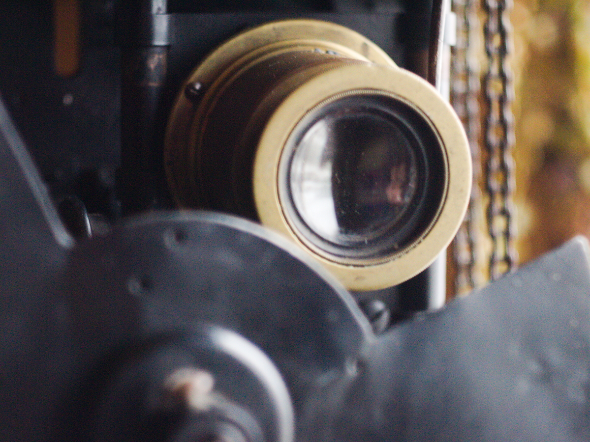 レンズはオリジナルではあるものの銘はなし。上映環境に応じ同一径であれば異なった焦点距離のレンズを使用することが可能でした。シャッター羽根は90度の角をなす二枚羽根構成、純正品(円をくり抜いた形の3枚羽根)ではなく別な映写機のパーツを流用しています。