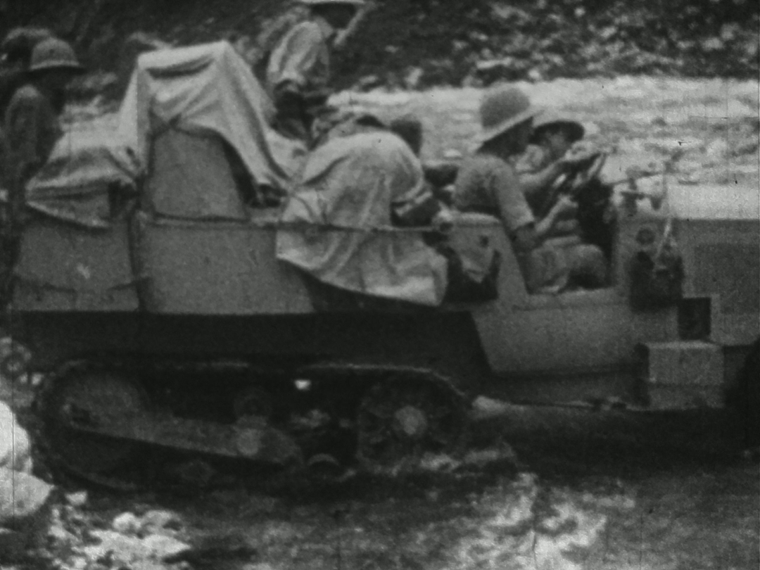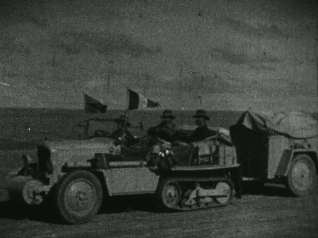 砂漠や砂利道、雪道など悪路を想定し、後輪にキャタピラを履かせたシトロエン社特製車です。ヒマラヤ越えを念頭に置き、手動で分解~組み立てができる構造になっていました。分解した車両を地元の苦力(クーリー)が運んで行く様子を映画中に見ることができます。