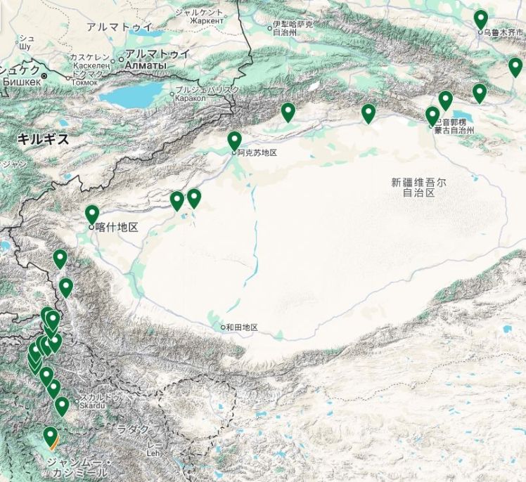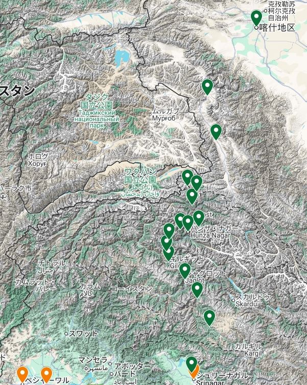 カシミール渓谷 [Vale of Kashmir] – バージル・パス [Burzil Pass] – アストール [Astore] – バンジ [Bunji] – ギルギット [Gilgit] – ノマル [Nomal] – チャラット [Chalat] – フンザ [Hunza] – フンザ・ナガー [Hunza Nagar] – パス [Passu] – ミガー [Misgar] – ミンタカ峠 [Mintaka Pass] – キリク峠 [基里克达坂/Kilik Pass] – タシュクルガン [塔什库尔干/Tashkurgan] – カラクリ湖 [喀拉库勒湖/Karakul Lake] – カシュガル [喀什/Kashgar] – マラルベシ [巴楚/Maralbexi] – トムシュク [图木舒克/Tumxuk] – アクス [阿克苏/Aksu] – バイ [拜城/Bay] – ブグル [轮台/Luntai] – コルラ [库尔勒/Korla] – 焉耆回族自治県 [Yanqi Hui Autonomous County] – 新井子 [Xinjingzi] – トクスン [托克逊县/Toksun] – ウルムチ [乌鲁木齐/Urumqi]
