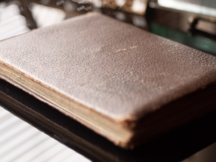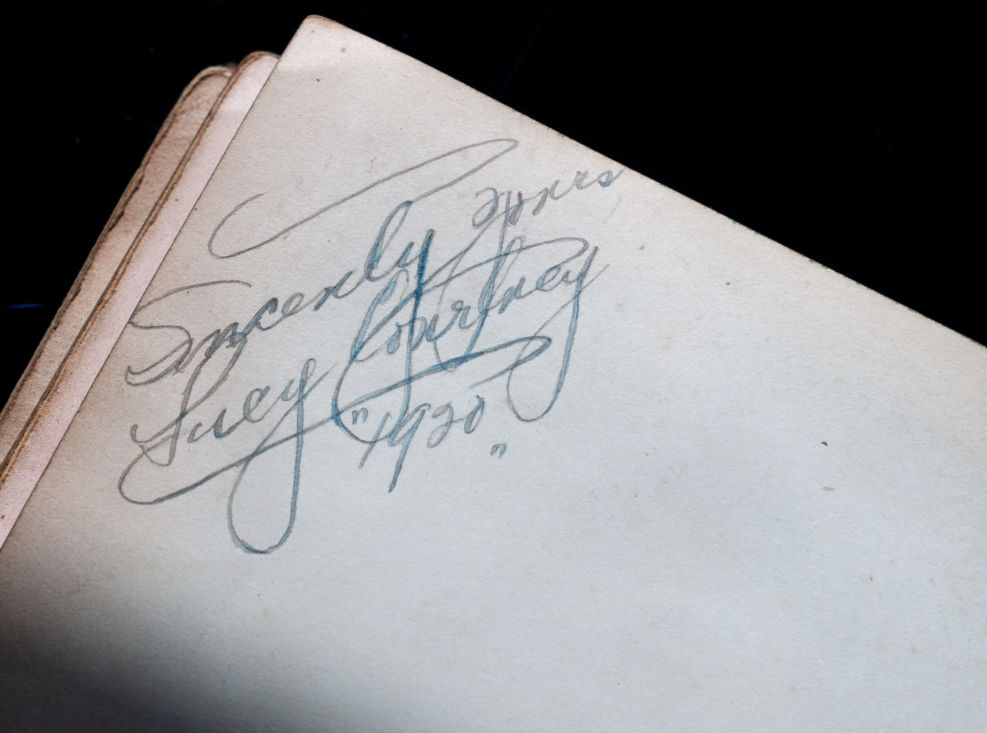 サイン帳は縦10.5㎝×横13.0㎝、80ページに渡っています。表紙に損傷が目立ち、本体も色あせや染みが多くあります。ページ剥落などはなく、百年近い時間の経過を考えるとまずまずの保存状態と言えます。