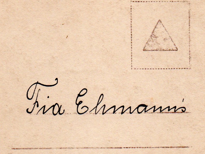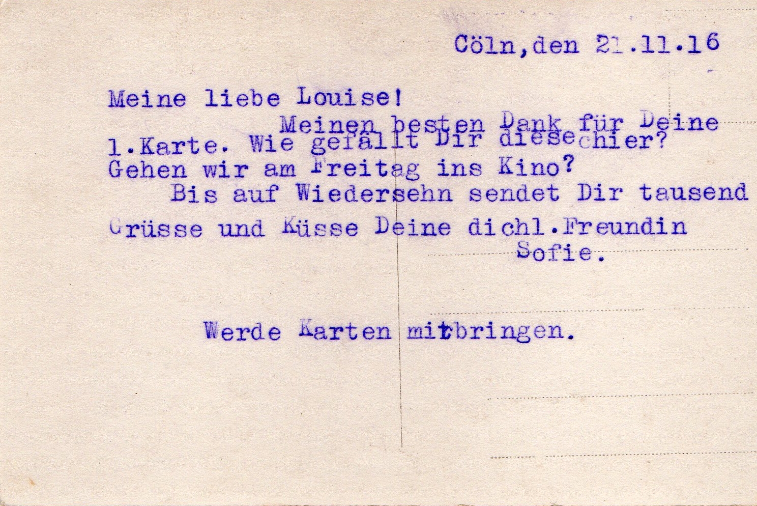 サインの宛名は「フィア・エーマンス(Fia Ehmanns)」となっています。郵送時の住所から、ケルン市内、ライン川にほど近いセヴェリンシュトラーセ239番地に住んでいたことも分かりました。後述の資料から伺えるように、本名はソフィアあるいはソフィーさんだったと思われます。