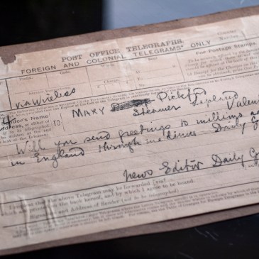 複写式のカーボン紙に記録された電報を台紙に貼ったもの。サイズは縦12.5×横19cm。 送信者名と住所は「メアリー・ピックフォード/ラップランド号」。文面は: 「数百万の英国フアンの皆様に、デイリー・グラフィック紙経由で … 続きを読む : 大正11年(1920年) – フェアバンクスとの新婚旅行道中の蒸気船から送られたメアリー・ピックフォードの電報
