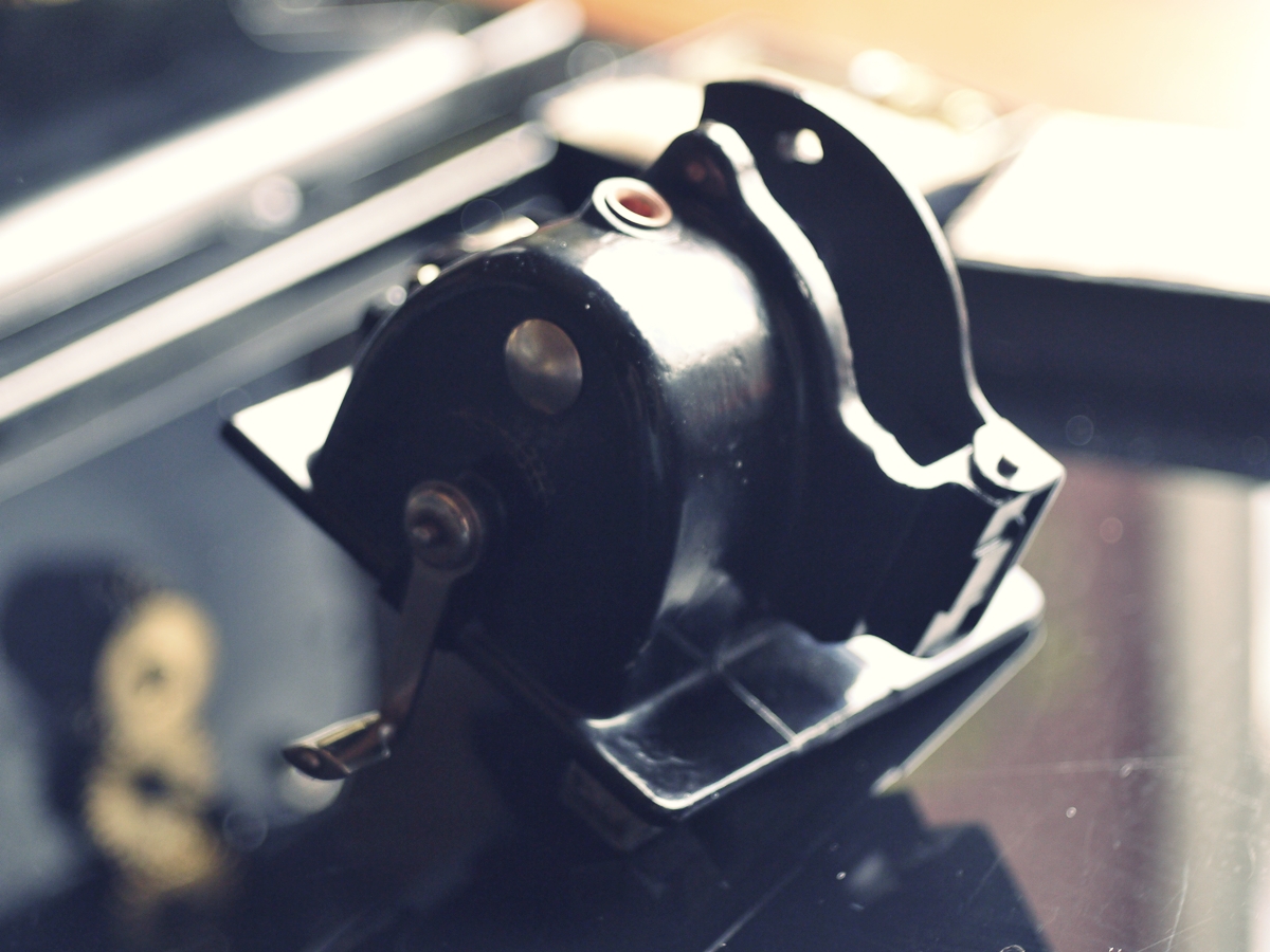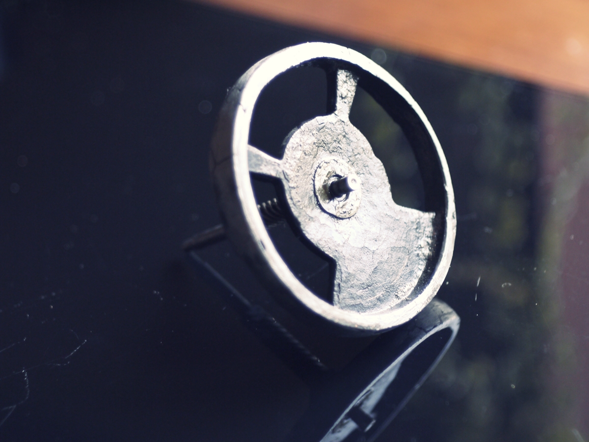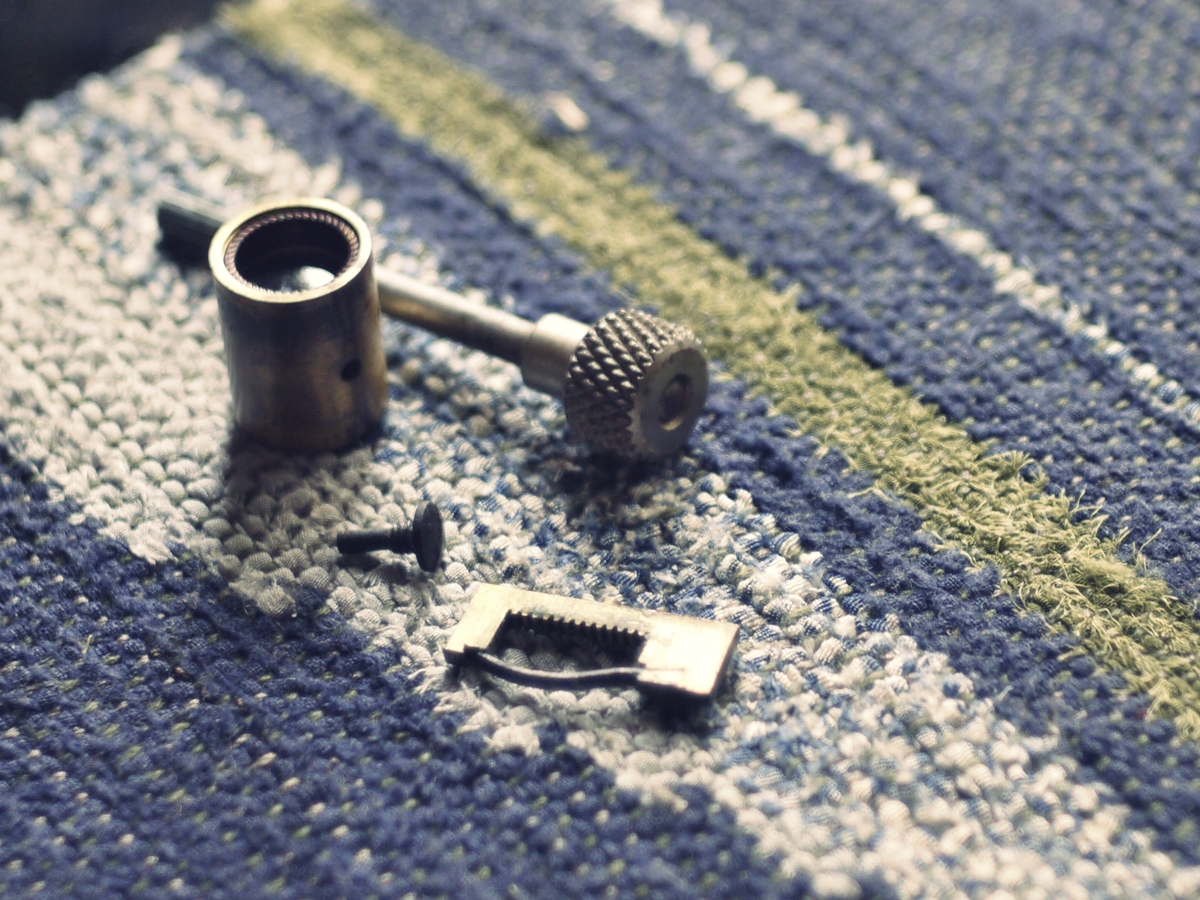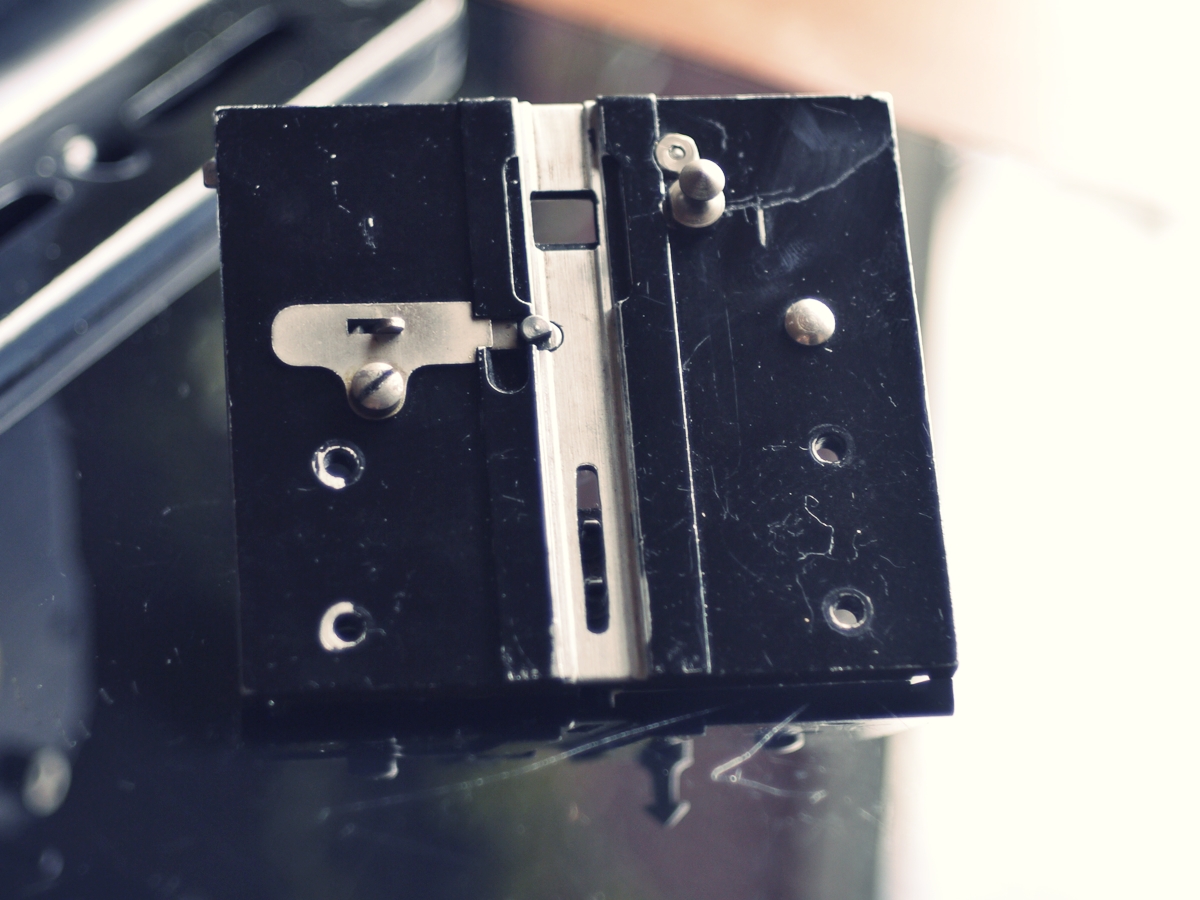 映写機の「背中」に当たる部分はフィルムを通す真鍮製のゲージと、ノッチ(フィルム脇の凹んだ部分で一時停止を行う)を読み取るシステムが組みこまれています。