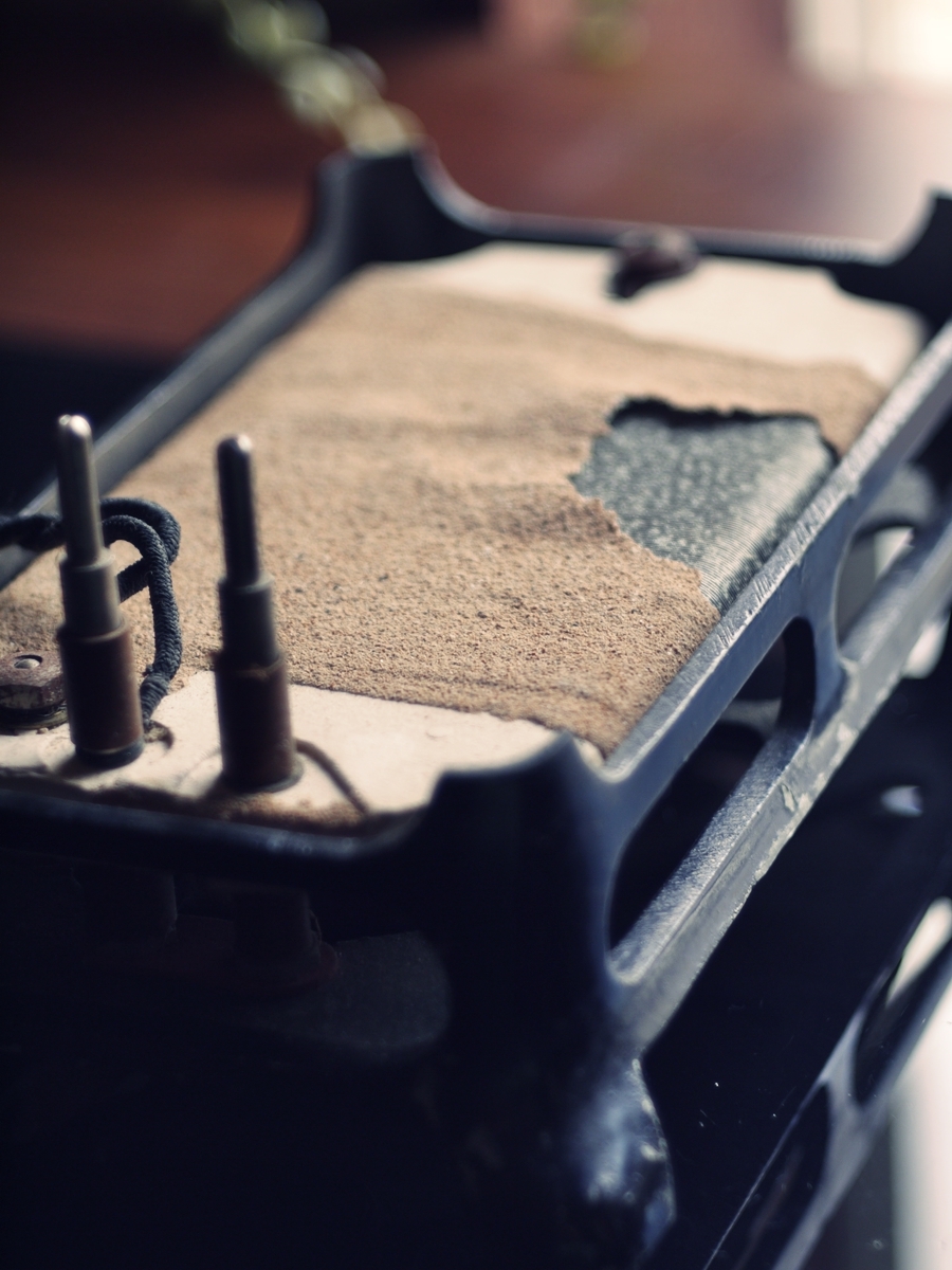 パテベビー映写機は元々ニワトリをイメージしてデザインされたものです。その「胴体」に当たる部分で、ギアなどを組みこんだ堅牢な作りになっています。保存状態が悪いと塗装が剥げやすいのが弱点。