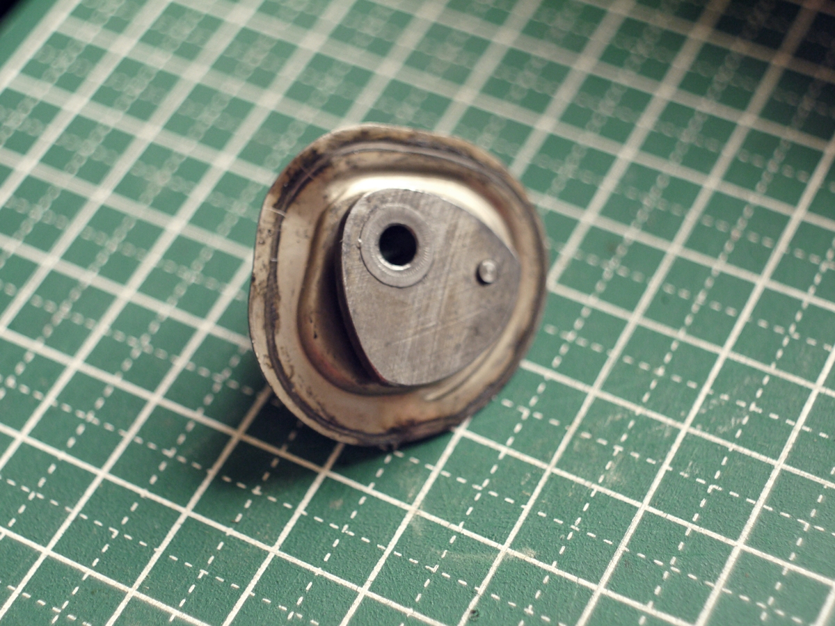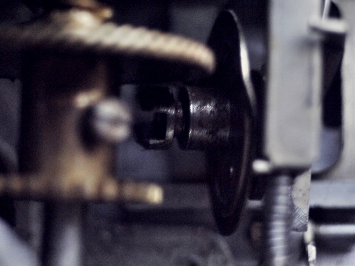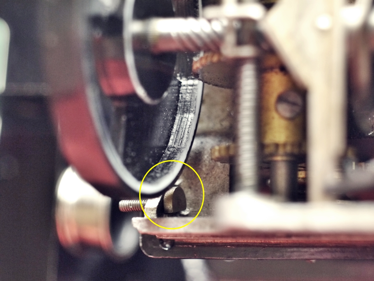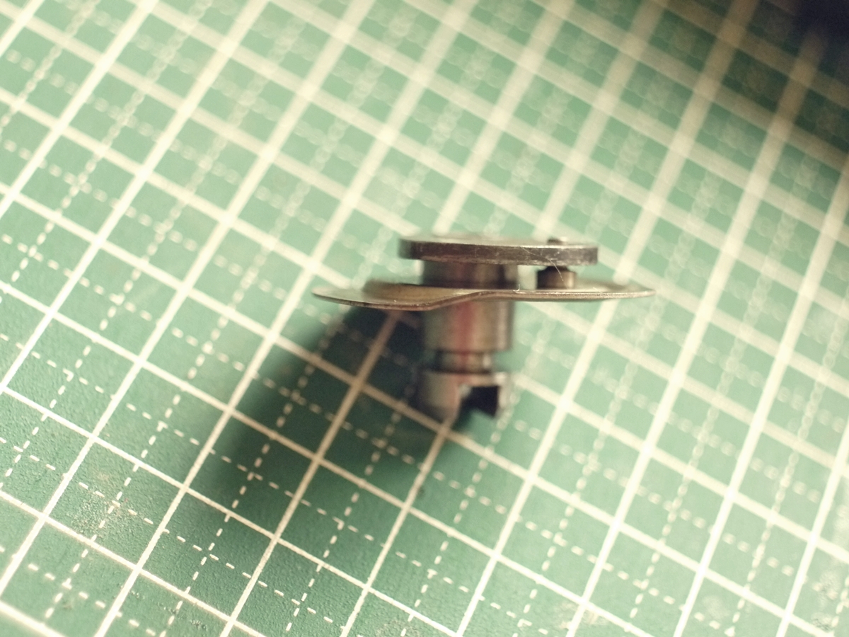 背面部の取付けと並んで、パテベビー映写機の組み立てでは難易度の高い作業です。円いシャッター羽根の中心を通した軸を軸穴に差しこんでいくだけなのですが、その際に下のパーツが上手くはまるようにセットします。
