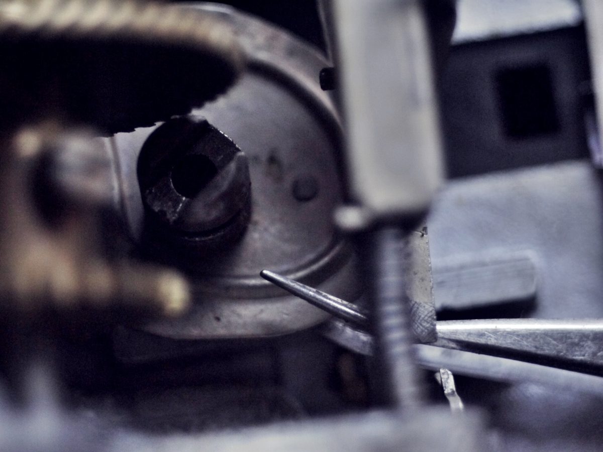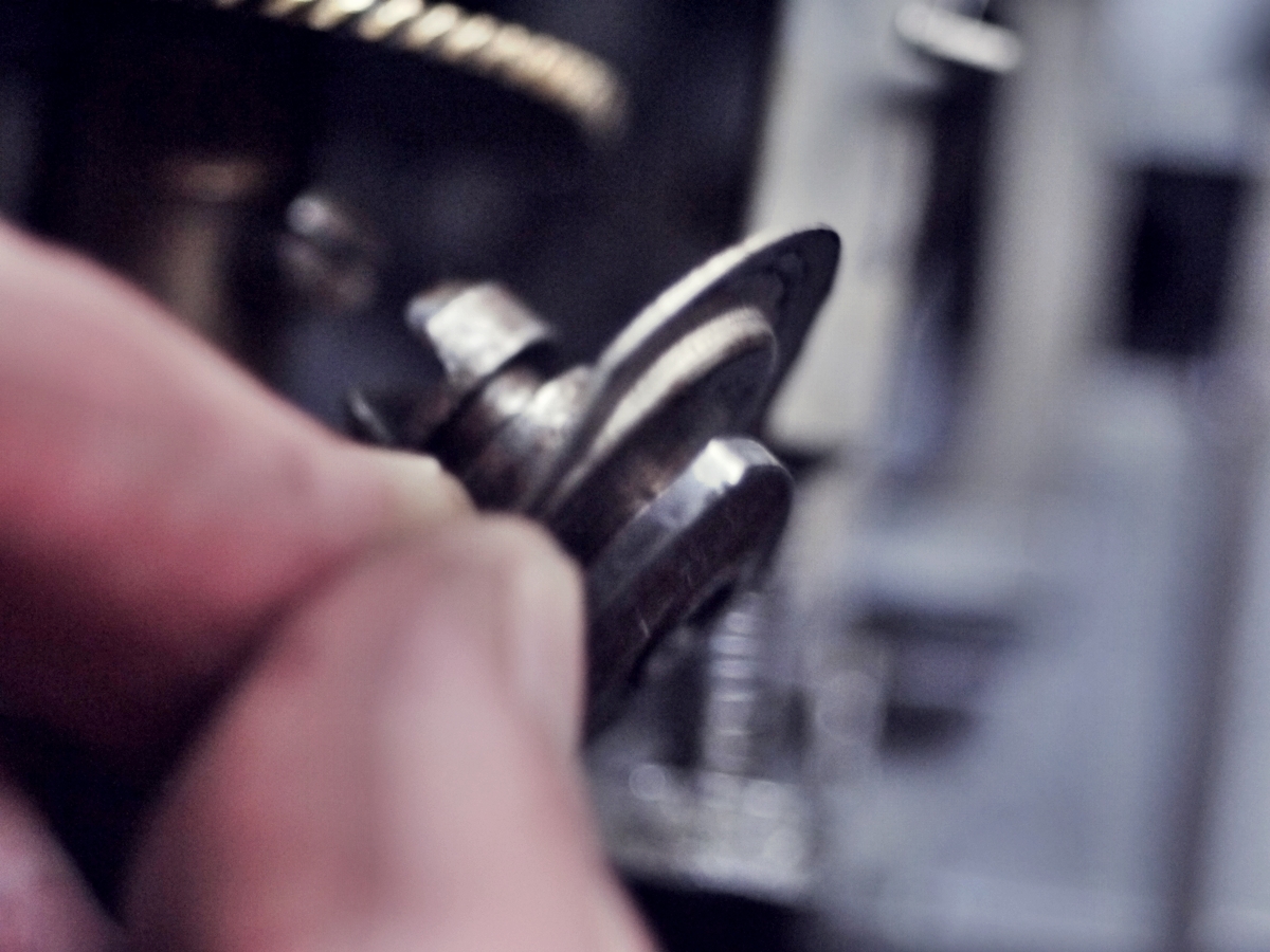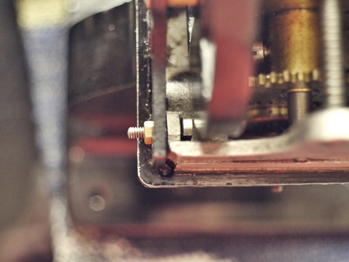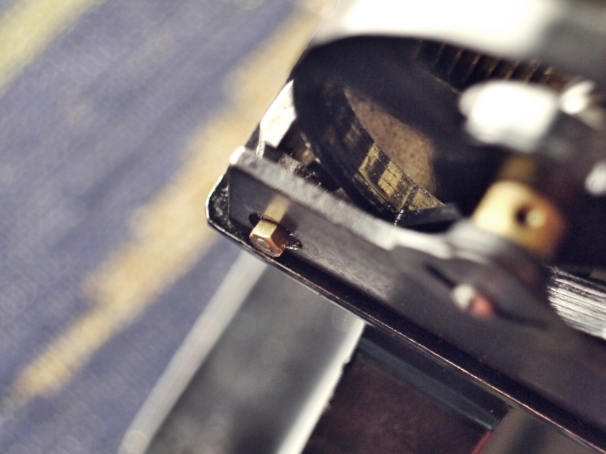 シャッター羽根を固定する板パーツを押しこみ、金色の小ナットで締めていきます。この時の重要なポイントは「きつく締め過ぎないこと」。シャッター羽根の動きに若干の遊びが必要なため、ちょっとぐらつく位の隙間を作らないと動かなくなります。