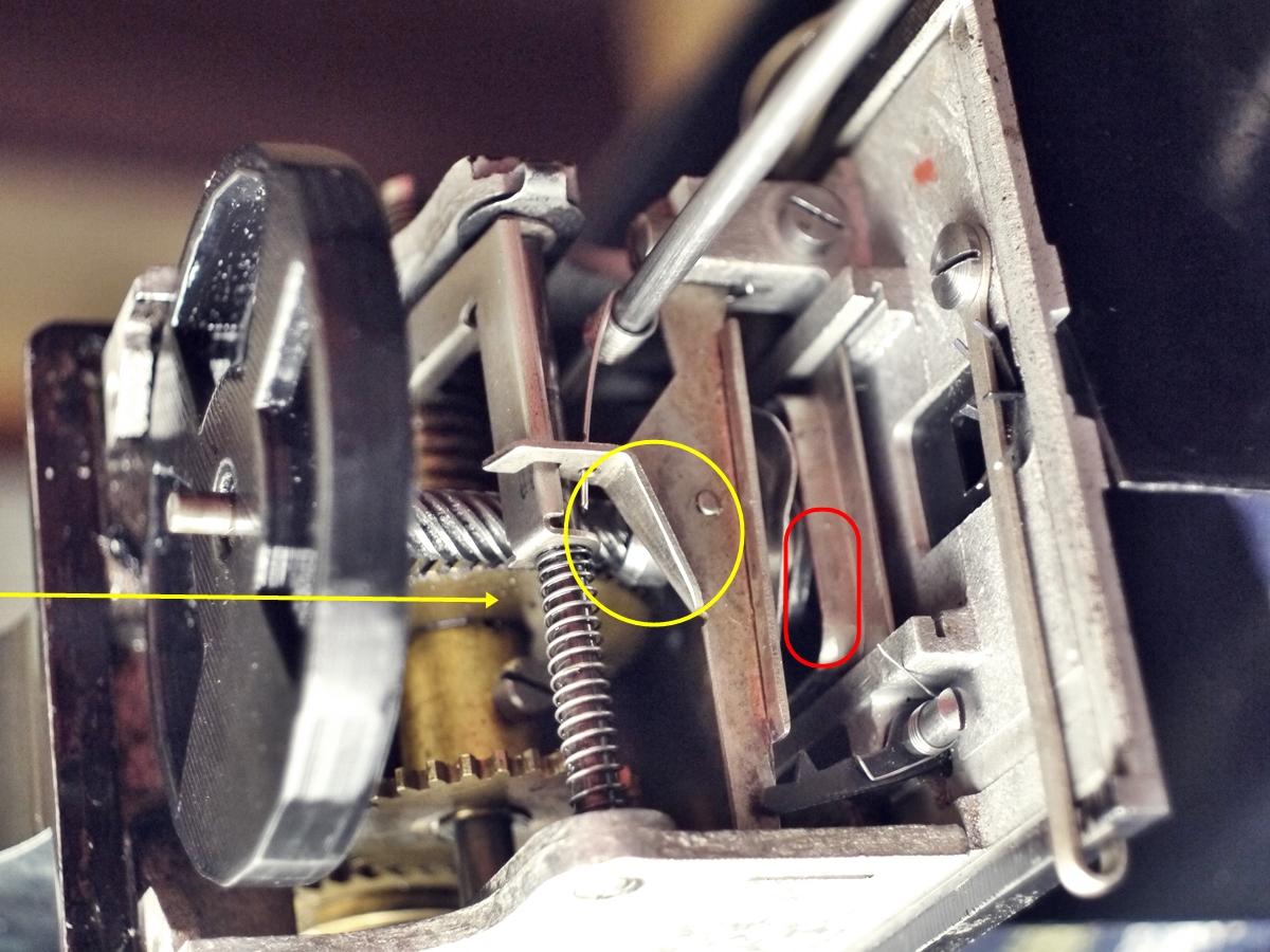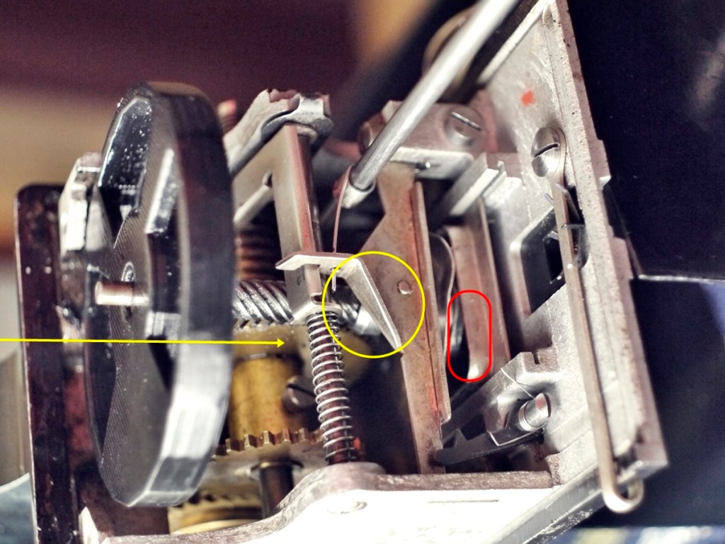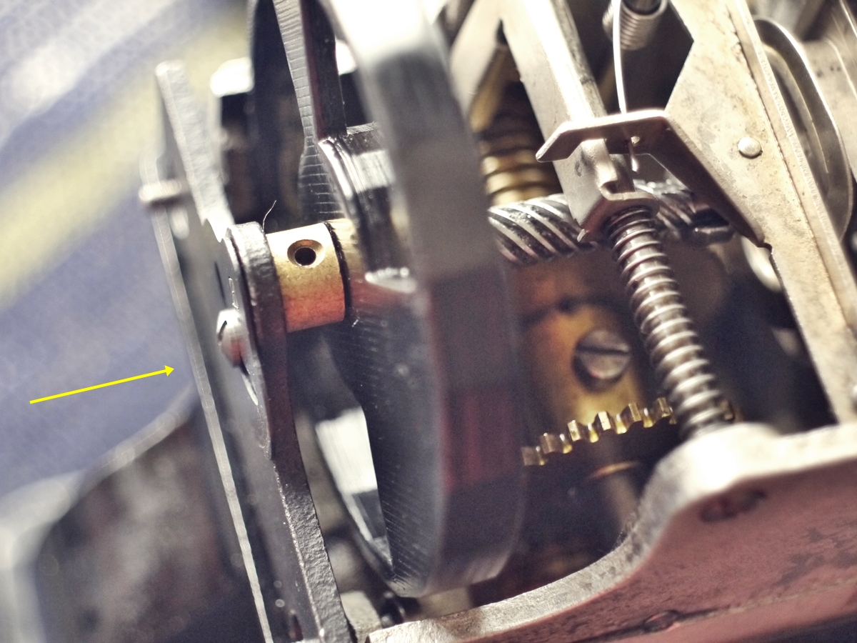軸穴を通す穴の周りにおにぎり型の膨らみがついています。よく見てみるとその周りの金属の板にも平べったい「S」の段差がついています。別項にて詳述しますが、この段差や膨らみでフィルム送りの鉤爪が上下+前後運動できる仕掛けになっています。