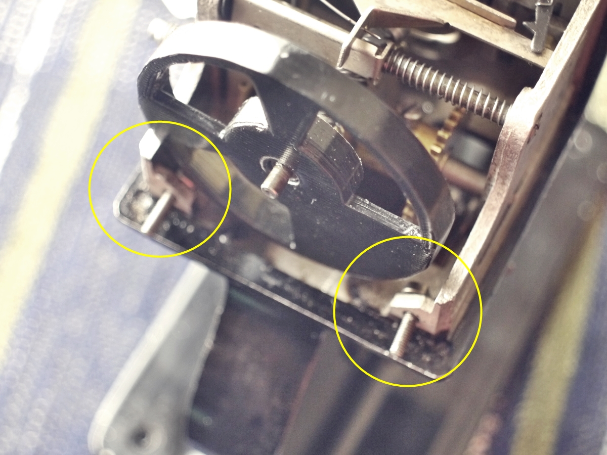 ギアとシャッター羽根をはめこんだ後はビスで固定していきます。今回は内側から外に向けてネジを差します。ネジの頭の部分に向きがあり、写真右の黄丸の形に固定。