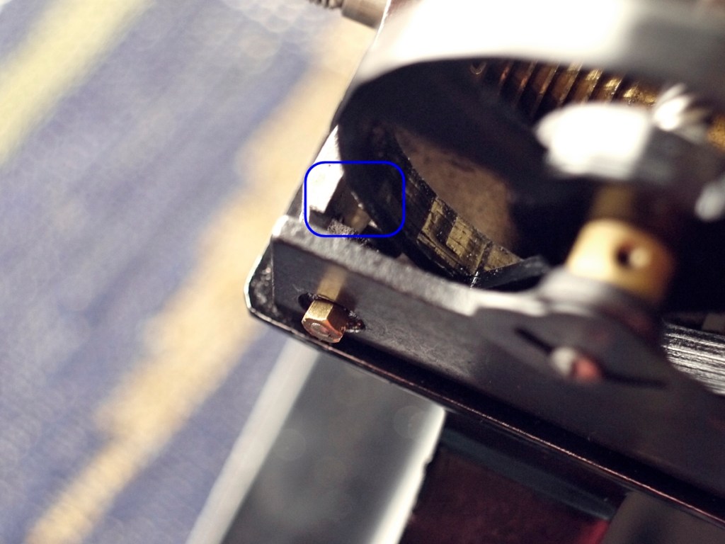 今回は3Dプリンタで自作したシャッター羽根を使いました。パテ社純正の円形シャッターは経年劣化で歪みや膨らみが発生しやすく、上の写真の青い枠の部分で干渉して動かなくなるパターンが目立ちます。わずかな歪みであれば金属ヤスリで削ってしのぐ、という手もあります。