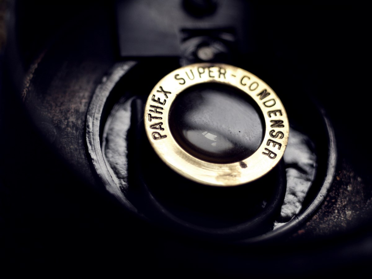 正面を向いたパテベビー映写機が背負っている円いパーツがランプハウスです。中にランプが収められているだけでなく、フィルムを押さえる役割も果たしています。